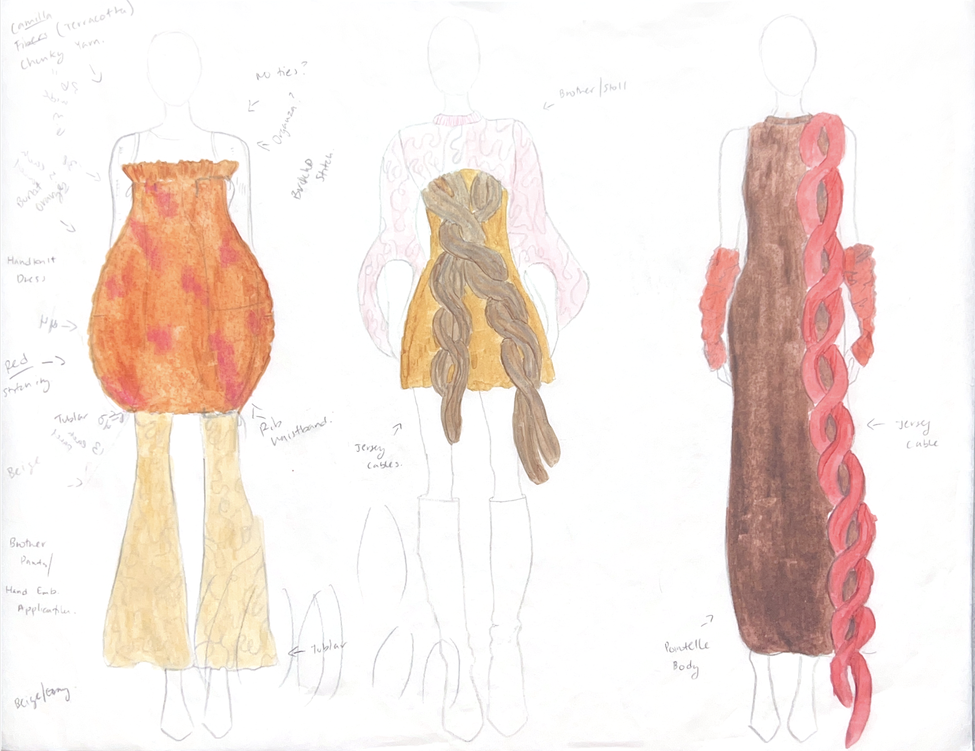 With the use of aran cables, I created an irregular cable design that is incorporated into skirt of the dress.