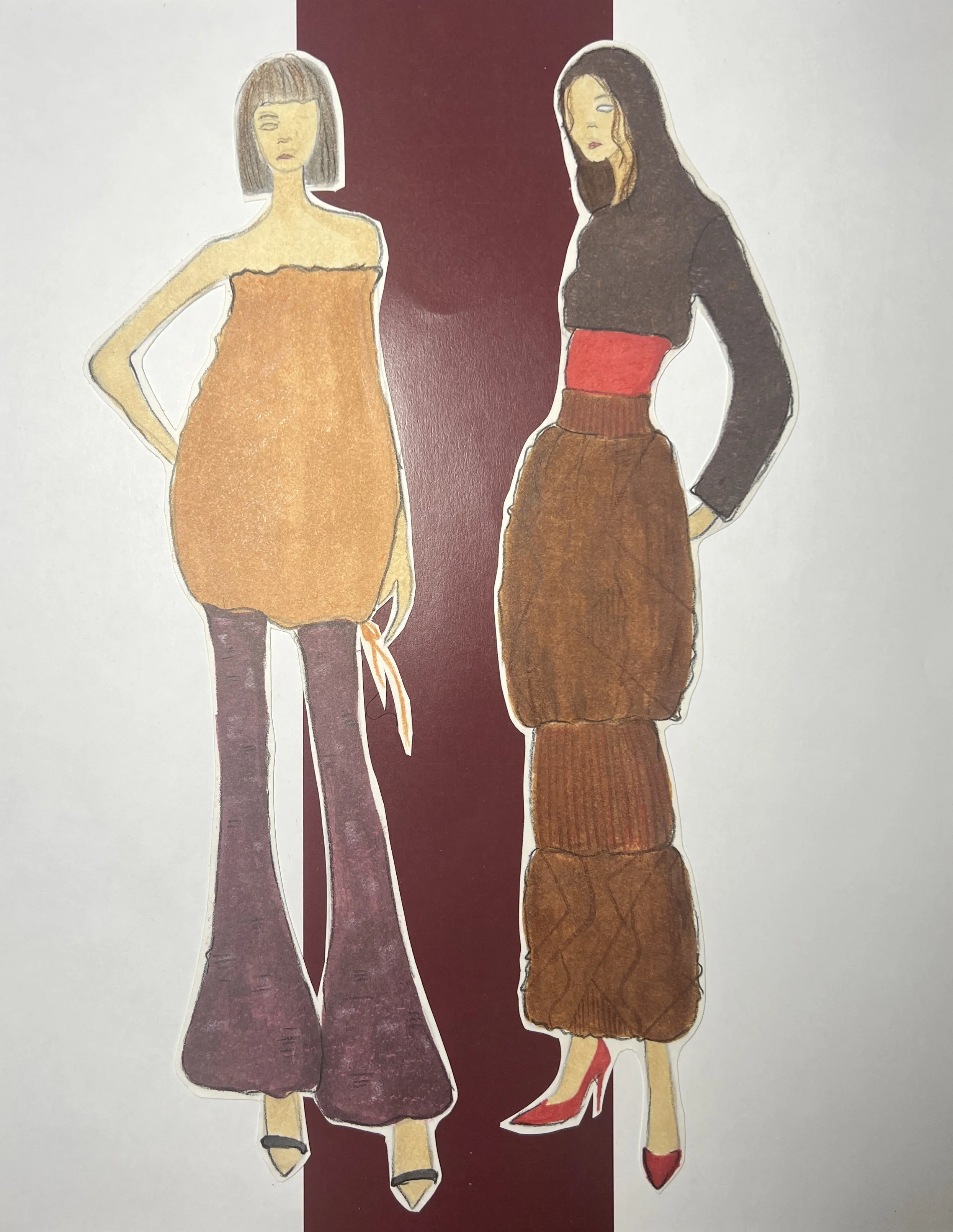 Skirt 2 is smaller in size with less volumen and open bottom to allow for movement.Both consist of irregular aran cables all over.